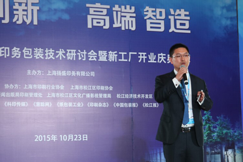 2015年10月23日,由上海揚(yáng)盛印務(wù)有限公司主辦,上海市印刷行業(yè)協(xié)會(huì)、上海市松江區(qū)印刷協(xié)會(huì)協(xié)辦的“2015年揚(yáng)盛印務(wù)包裝技術(shù)研討會(huì)暨新工廠開業(yè)慶典”在上海世茂佘山艾美酒店舉行。本次技術(shù)研討會(huì)以“綠色、創(chuàng)新、高端、智造”為主題,旨在展望市場(chǎng)和行業(yè)的新趨勢(shì),探討印刷和包裝行業(yè)的最新技術(shù)和應(yīng)用,引領(lǐng)行業(yè)的創(chuàng)新與可持續(xù)發(fā)展。